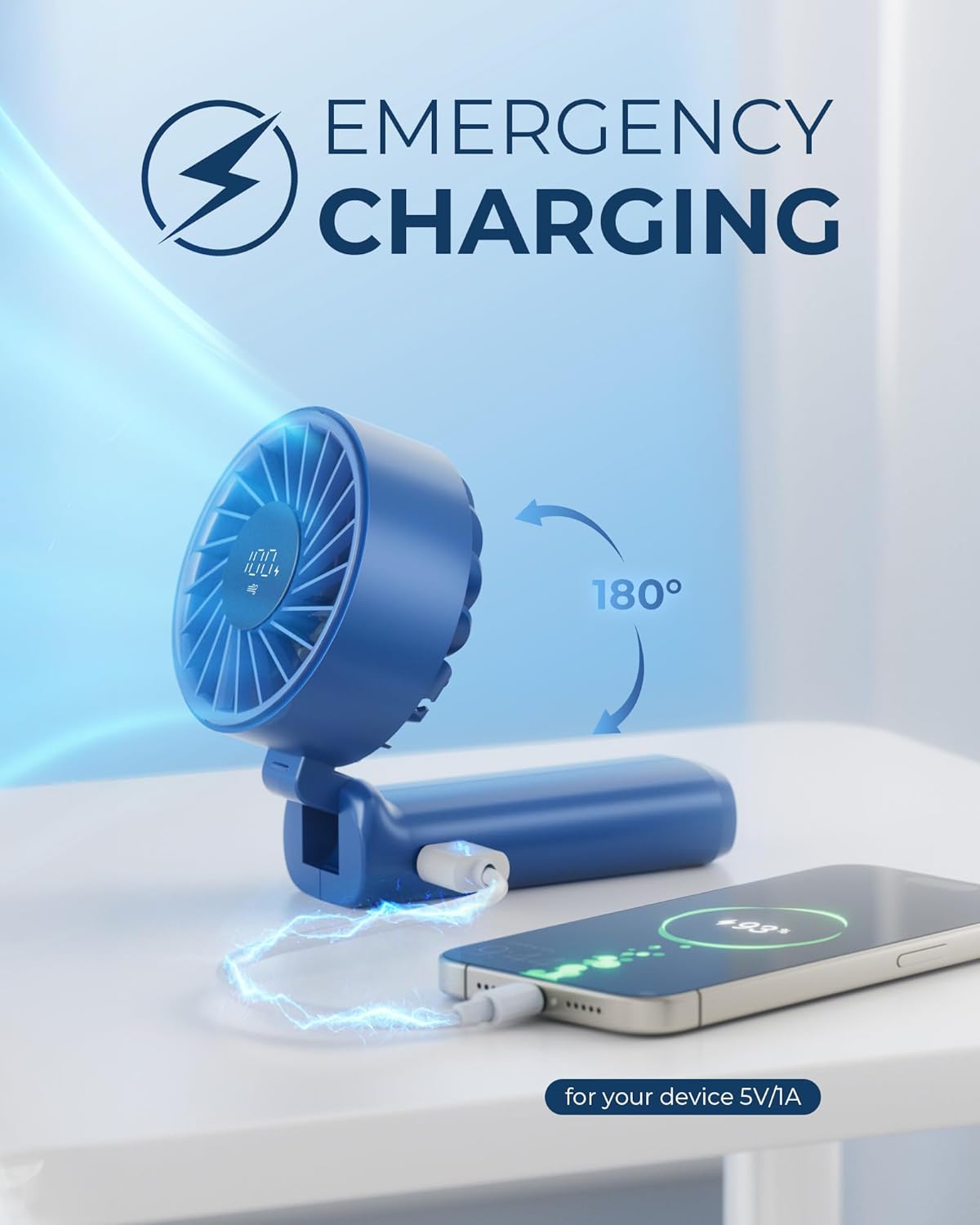 Beyond cooling, this fan offers smart versatility. The USB output port allows it to function as an emergency power bank, capable of charging your smartphone, earbuds, or other USB devices on the go. Thanks to its foldable design, the fan easily transitions from handheld to desktop mode with a simple adjustment.